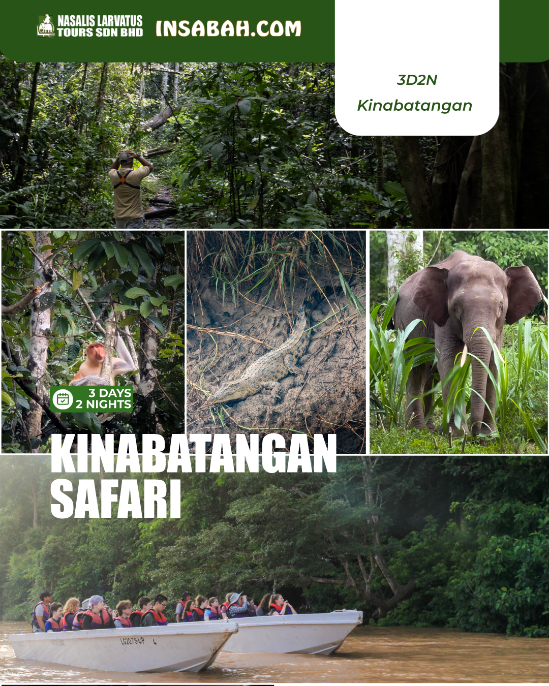 Catch the beautiful sight of the misty Kinabatangan River at 0500 hrs. Join the boat cruise at 0600 hrs and see the exciting wildlife as they just awake from a night sleep. Various species of wildlife may be seen such as Proboscis Monkeys, Leaf Monkeys, Macaques, Gibbons and even the Orang Utans. Return back for breakfast at 0700 hrs. At 0900 hrs, proceed on foot with our professional jungle guide to the Bilit Ox-Bow Lake behind the Lodge. This is the time to getan up close and personal glimpse of exquisite insects and birds life. You will also walk on the path of the newly discovered “Borneo Pygmy Elephants” (relatively, it’s the smallest elephant in the world). Return to the Lodge for lunch at 1200 hrs. Rest after lunch and another boat ride at 1600 hrs awaits you to cruise along the Kinabatangan River for more wildlife sight-seeing. Return before dinner at 1800 hrs. Dinner will be served at the Lodge. After that, there will beanother guided night walk, this time using a different route. Then overnight at the Lodge. (BF/L/D)